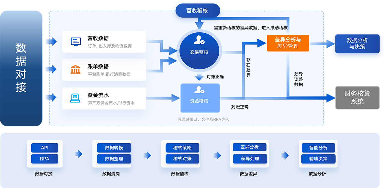 稽核平台全面覆盖营收对账全流程,从数据采集、清洗、稽核到差异处理,实现全自动化、智能化管理